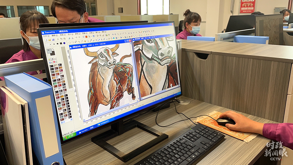 設(shè)計(jì)研發(fā)部正在修改名為“奮發(fā)圖強(qiáng)”的藏毯圖樣。 (總臺(tái)央視記者楊松濤、楊立峰拍攝)