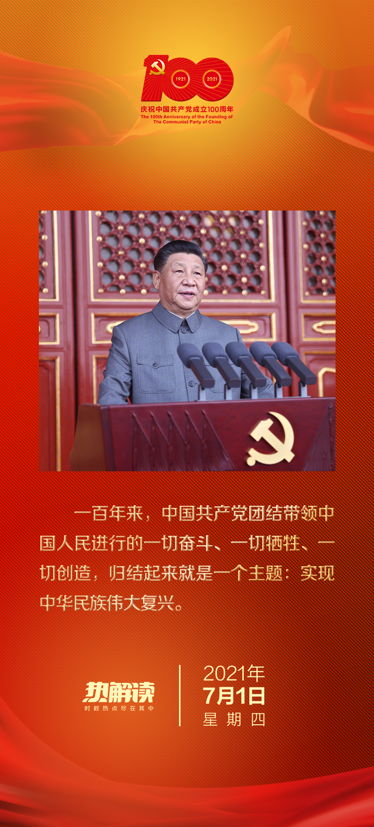 “一百年來,中國共產(chǎn)黨團(tuán)結(jié)帶領(lǐng)中國人民進(jìn)行的一切奮斗、一切犧牲、一切創(chuàng)造,歸結(jié)起來就是一個(gè)主題:實(shí)現(xiàn)中華民族偉大復(fù)興?!绷?xí)近平總書記的精辟論述,高度概括了中國共產(chǎn)黨百年歷史。