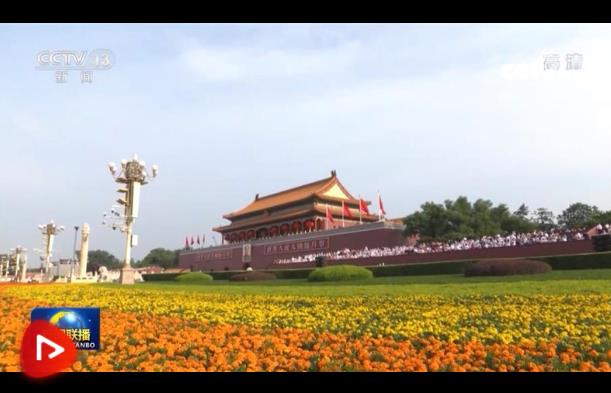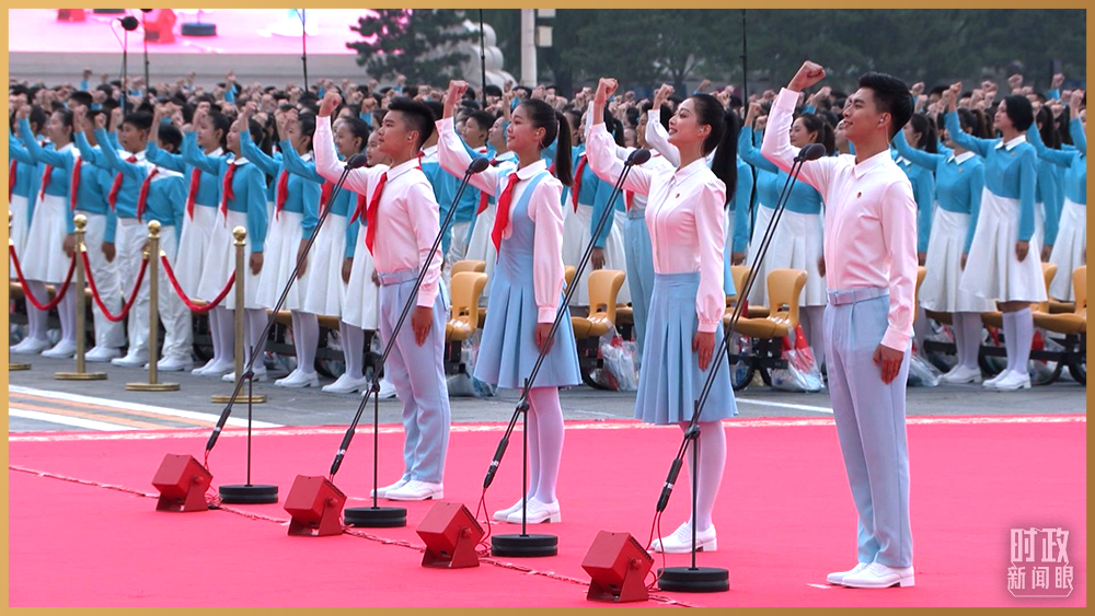 8點(diǎn)整,慶祝大會開始。100響禮炮響徹云霄。現(xiàn)場升國旗、奏唱國歌。此后,各民主黨派、工商聯(lián)和無黨派人士聯(lián)合致賀詞,由共青團(tuán)員和少先隊(duì)員組成的千人方陣集體致獻(xiàn)詞。