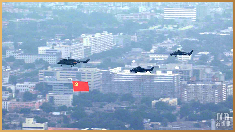 直升機(jī)懸掛鮮紅的中國共產(chǎn)黨黨旗飛過。