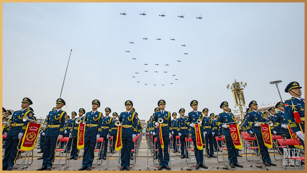 29架直升機(jī)組成“100”字樣掠過長空。(總臺記者廖江衡拍攝)