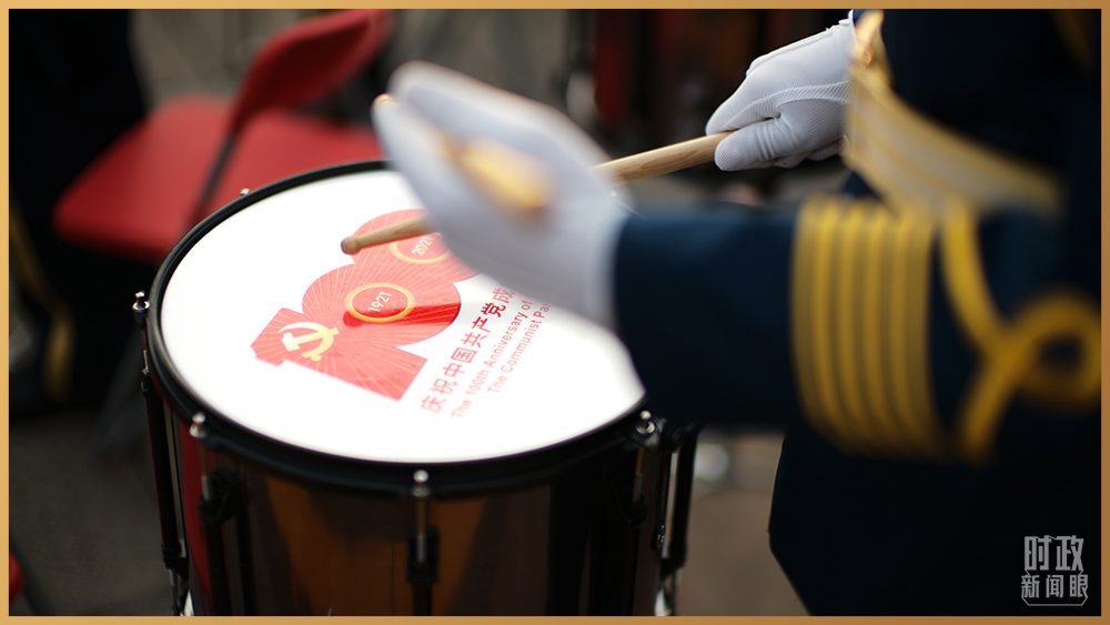 鼓面上帶有建黨百年慶?;顒訕?biāo)識(總臺央視記者彭漢明拍攝)