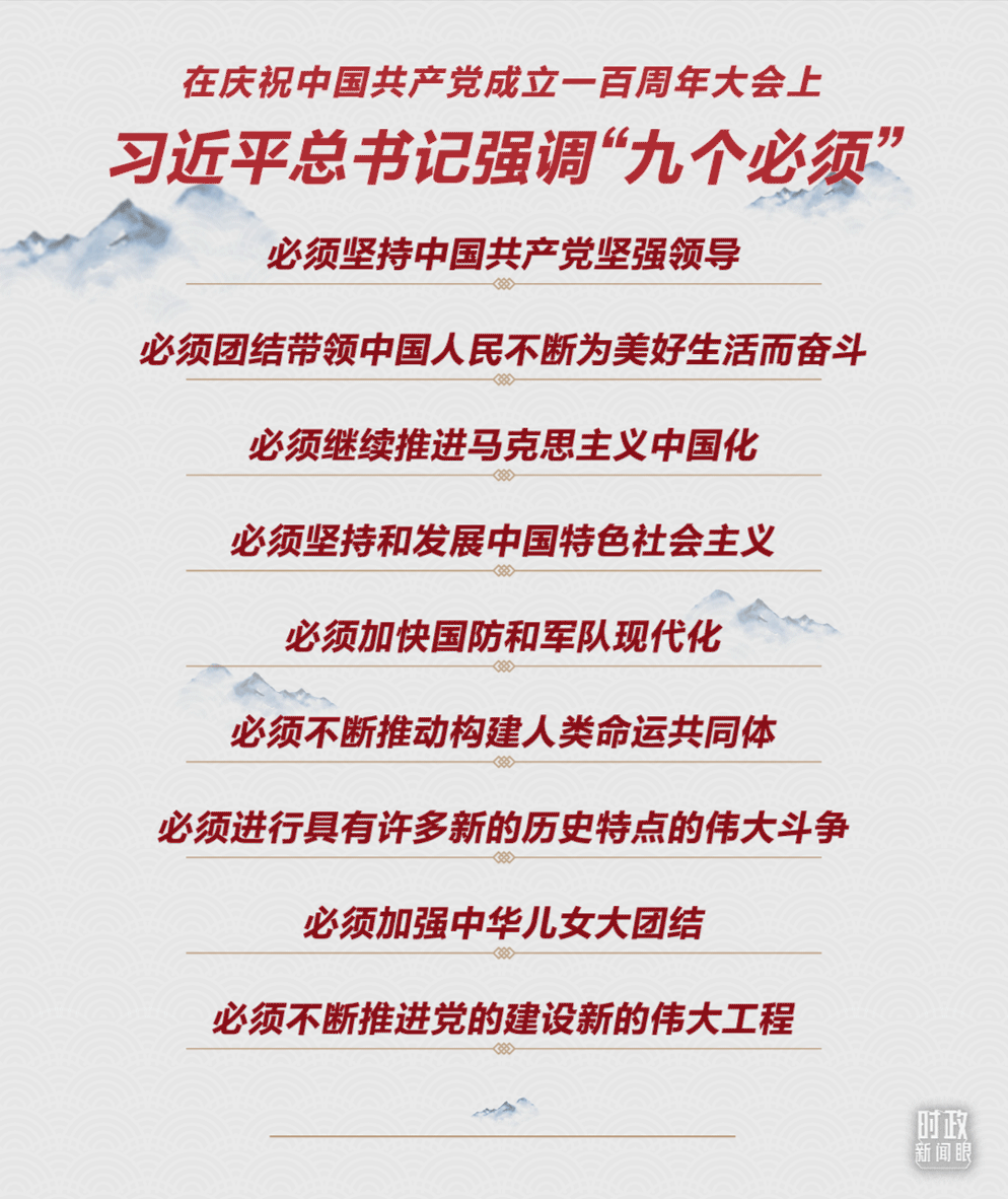 在7月1日的慶祝中國共產(chǎn)黨成立100周年大會上,習(xí)近平強(qiáng)調(diào),我們要用歷史映照現(xiàn)實(shí)、遠(yuǎn)觀未來,從中國共產(chǎn)黨的百年奮斗中看清楚過去我們?yōu)槭裁茨軌虺晒?、弄明白未來我們怎樣才能繼續(xù)成功。以史為鑒、開創(chuàng)未來,總書記提出“九個必須”,并作出許多新論斷、新表述。