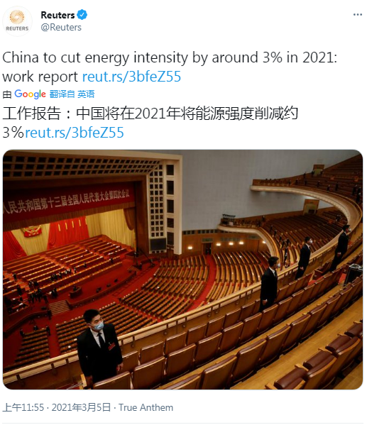 圖為兩會上的環(huán)保話題備受外媒矚目。路透社在推文中寫道,中國2021年發(fā)展主要預(yù)期目標(biāo):單位國內(nèi)生產(chǎn)總值能耗降低3%左右