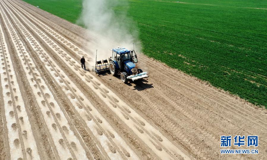 在新疆生產(chǎn)建設(shè)兵團第六師共青團農(nóng)場,一臺安裝北斗導(dǎo)航自動駕駛系統(tǒng)的播種機在播種棉花(2020年4月8日攝,無人機照片) 。新華社發(fā)(李華北 攝)