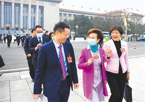 3月8日,十三屆全國人大四次會議在北京人民大會堂舉行第二次全體會議。會后,人大廣東代表團代表陳旭斌(左)、程萍(中)、郭姣(右)就宏觀政策保持穩(wěn)定等話題繼續(xù)交流。經濟日報-中國經濟網記者 李景錄攝