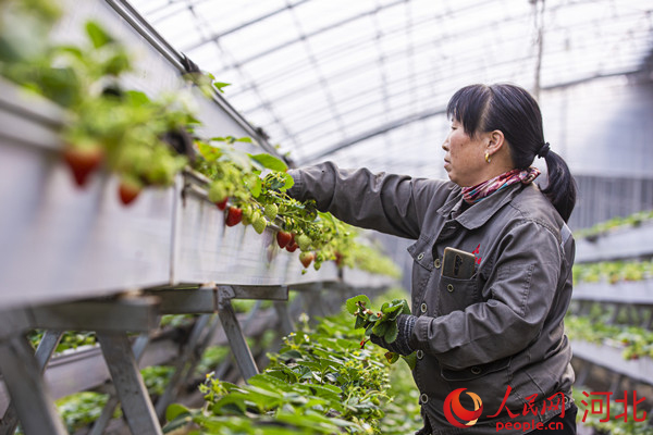 出香菇種植基地南行約3公里,就到了磁山二街的果蔬種植地。值守的工人趙師傅一按卷?yè)P(yáng)機(jī)按鈕,罩在外層的棚布徐徐卷起。推開(kāi)日光溫室大棚的門(mén),沿著用水泥鋪墊的路走進(jìn)草莓采摘棚里,一陣夾雜著草莓香氣的暖風(fēng)迎面撲來(lái)。大棚內(nèi)一排排種植草莓的架子呈“A”字形,一壟壟草莓呈梯次立體排列。滴滴水珠通過(guò)智能滴灌系統(tǒng)潤(rùn)澤著秧苗,顆顆紅寶般的草莓令人饞涎欲滴,綠葉間點(diǎn)綴著朵朵小白花,蜜蜂嗡嗡嚶嚶穿梭其間。