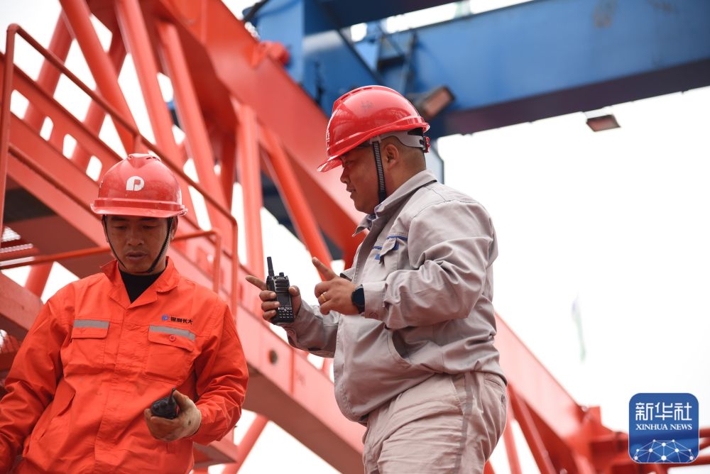 楊興義(右)在施工現(xiàn)場和工友討論(1月24日攝)。新華社記者田建川攝