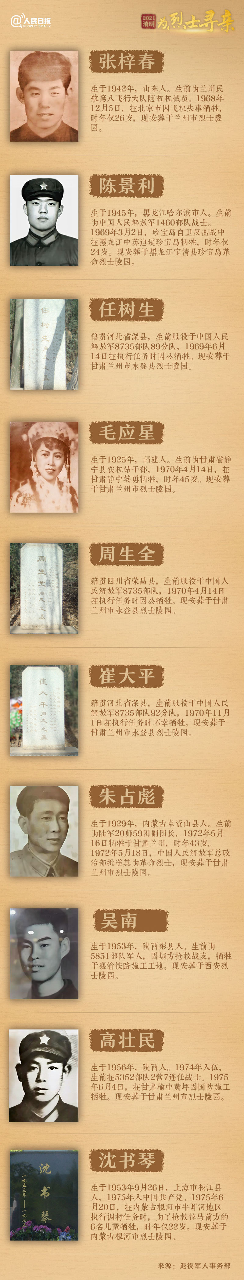同時(shí),退役軍人事務(wù)部聯(lián)合人民日?qǐng)?bào)客戶(hù)端等媒體,公布100位烈士的尋親線索。這100位烈士的犧牲時(shí)間跨越1928年到1984年。烈士們生前有的是軍人,有的是地下黨員,有的是工人,有的是教師學(xué)生。不少烈士的出生年份等關(guān)鍵信息缺失,一些烈士未留下照片。