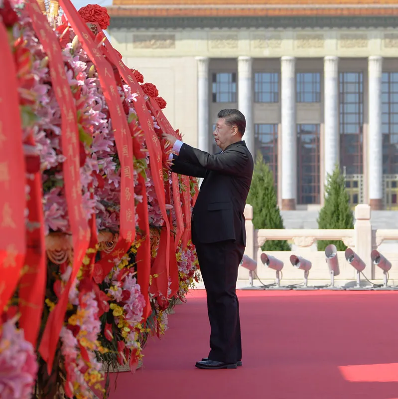 2020年9月30日上午,黨和國家領(lǐng)導(dǎo)人習(xí)近平、李克強、栗戰(zhàn)書、汪洋、王滬寧、趙樂際、韓正、王岐山等來到北京天安門廣場,出席烈士紀念日向人民英雄敬獻花籃儀式。這是習(xí)近平整理花籃上的緞帶。新華社記者 申宏 攝