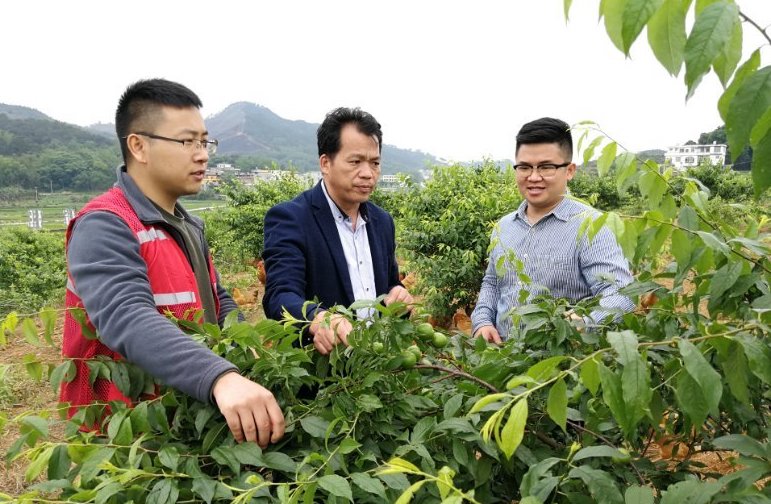 廣西馬山縣林圩鎮(zhèn)伏興村駐村第一書(shū)記周福波(左一)在查看村里已經(jīng)掛果的三華李。