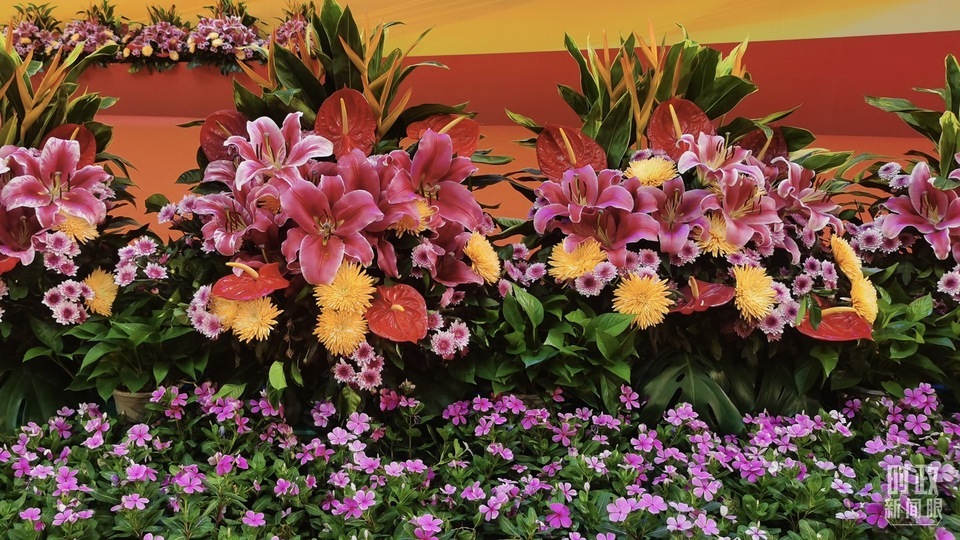 慶祝大會(huì)現(xiàn)場(chǎng)擺放的鮮花。(總臺(tái)央視記者范凱拍攝)