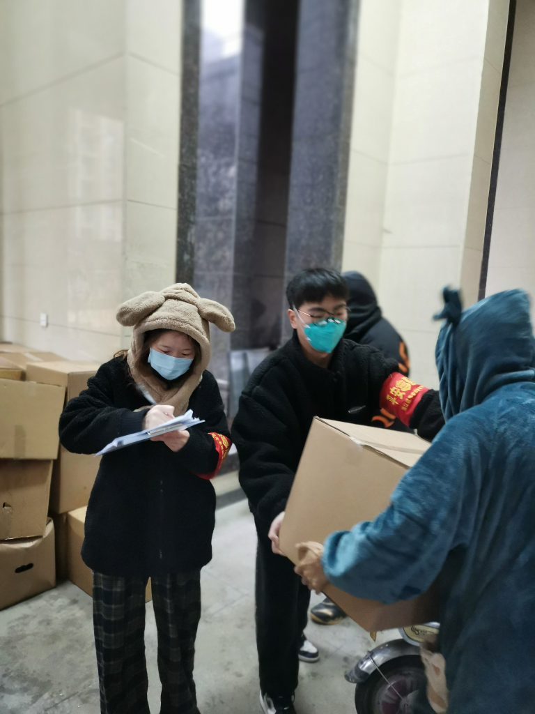 “90后”志愿者胡嬌嬌(左一)在協(xié)助登記進入小區(qū)的物資。(受訪者供圖)