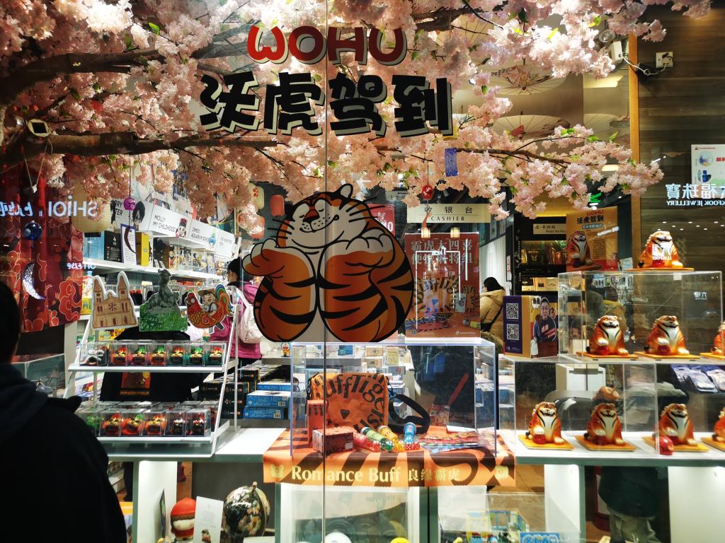 深受年輕人喜歡的國(guó)潮、文創(chuàng)、盲盒等產(chǎn)品也紛紛蹭起虎年熱度。在廣州聯(lián)合書店的文創(chuàng)區(qū),藝術(shù)家將老虎形象融入原創(chuàng)IP設(shè)計(jì),便攜麻將、解壓神器、虎頭擺件等占據(jù)櫥窗C位。廣州市民高小姐拿著一個(gè)虎頭挎包愛不釋手,她表示,春節(jié)期間很愿意買一些跟生肖有關(guān)的產(chǎn)品,“現(xiàn)在的生肖產(chǎn)品都既有設(shè)計(jì)又有創(chuàng)意,很貼合青年人喜歡的點(diǎn),所以看到喜歡的都愿意去買?!?/p>