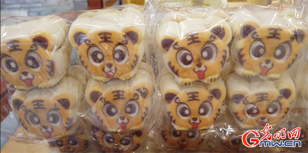 除了穿戴,食品中的“虎”元素也必不可少。在中華老字號北京稻香村,一款名為“大王餅”的糕點被擺在十分顯眼的位置?!按笸躏灐蓖庥^上看是一個呆萌可愛的老虎頭,內(nèi)有雞肉松餡兒。虎年即將到來,“大王餅”頗受歡迎。“周末客流量大時,每天可以賣掉四五百塊?!北本┑鞠愦?前門店)店員說。