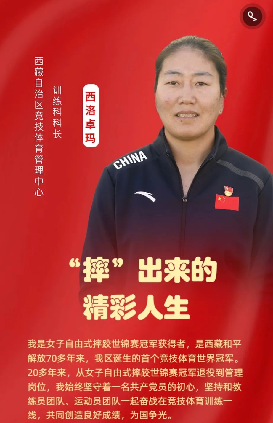 她是摔跤名將,是西藏和平解放70多年來,西藏誕生的首個(gè)競技體育世界冠軍。20多年來,從女子自由式摔跤世錦賽冠軍退役到管理崗位,她始終堅(jiān)守著一名共產(chǎn)黨員的初心,堅(jiān)持和教練員團(tuán)隊(duì)、運(yùn)動員團(tuán)隊(duì)一起奮戰(zhàn)在競技體育訓(xùn)練一線,共同創(chuàng)造良好成績,為國爭光。