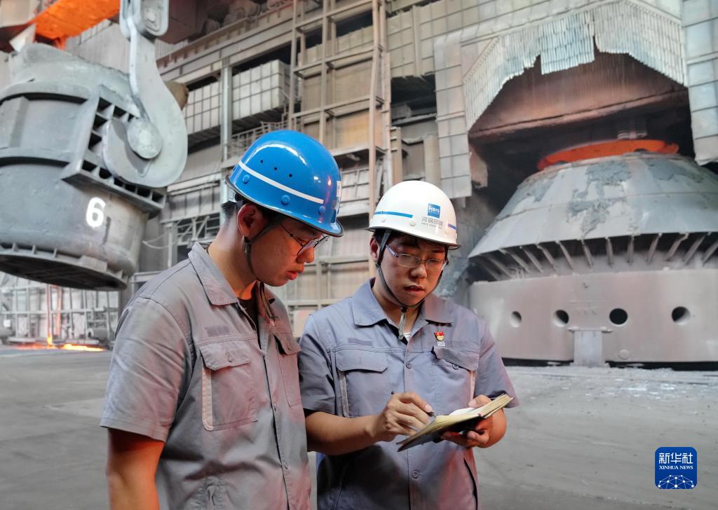 邯寶煉鋼廠特檔技術(shù)主管、轉(zhuǎn)爐車(chē)間副主任唐笑宇(右)在轉(zhuǎn)爐車(chē)間控制室工作(2022年9月7日攝)。新華社記者 楊世堯 攝