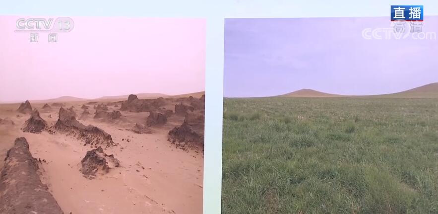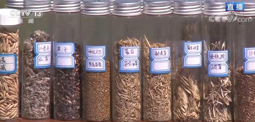 當(dāng)然,光憑著“帶薪休假”這樣的“保養(yǎng)”是遠(yuǎn)遠(yuǎn)不夠的。烏拉蓋草原的土壤屬于沙化土壤,所以一旦遇見極端天氣或者是植被被破壞后,就會產(chǎn)生風(fēng)蝕坑和沙化草地。2010年前,當(dāng)?shù)氐纳郴娣e一度超過5000多畝。我身旁的這張圖,就是當(dāng)年沙化草原的真實(shí)寫照。那么您再看右邊這副照片,通過這個小山坡可以看到兩張照片是拍攝于同樣的地點(diǎn),但是樣貌已經(jīng)發(fā)生了翻天覆地的變化,原本光禿禿的草原是如何搖身一變換上一身鮮艷的綠裝呢?那就要看我身旁的這些瓶瓶罐罐了,這里面裝著的就是草種,這是林草專家歷時多年搜尋、試驗(yàn)尋找到的適合烏拉蓋草原氣候、水土條件,能夠快速生長的草種。像我手上拿的就是沙生冰草,這種草種非常適合生長在沙化土壤,有很強(qiáng)的耐寒性和耐旱性,可以改良草場,而且還非常適合放牧利用。有了這些草種以后,我們就可以進(jìn)行沙化草地的治理了,您現(xiàn)在看到的就是沙化草地的治理現(xiàn)場,我們在平整完土地后,把這些草種進(jìn)行科學(xué)補(bǔ)播,最后鋪設(shè)沙障,通過這種科學(xué)治理的新方式來防風(fēng)阻沙,改變風(fēng)蝕狀況,讓烏拉蓋草原恢復(fù)生機(jī)。