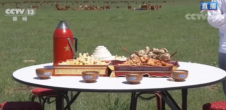 大家知道我們《大美邊疆行》來這里拍攝,都非常熱情,還特意備下了盛宴,為了更好地展示,我們也特意從蒙古包里搬到了草原上。可以看到桌子上已經(jīng)準(zhǔn)備上了花式各樣的奶豆腐,還有草原上必不可少的手把肉、奶茶。今天通過我們的鏡頭,給全國的觀眾朋友發(fā)出一份邀請,希望大家有時間能夠來到烏拉蓋,欣賞大美的草原風(fēng)光的同時,體驗(yàn)一把牧民當(dāng)下的幸福生活。