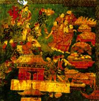 描繪清帝對(duì)五世達(dá)賴及其隨行人員的貢賞圖(布達(dá)拉宮壁畫)
