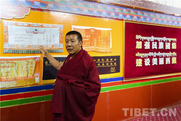 圖為扎什倫布寺管委會(huì)副主任賽巴·多布瓊在該寺民族團(tuán)結(jié)和愛國主義教育基地講解 攝影:趙振宇
