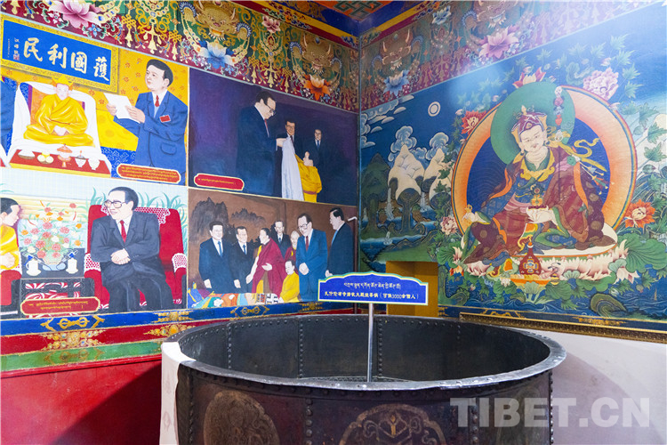 與寺廟內(nèi)傳統(tǒng)的佛教題材壁畫不同,在什倫布寺民族團(tuán)結(jié)和愛國主義教育基地展廳北側(cè),繪制著十世班禪額爾德尼·確吉堅(jiān)贊與歷代黨和國家領(lǐng)導(dǎo)人重要的會(huì)面時(shí)刻以及十一世班禪額爾德尼·確吉杰布金瓶掣簽的整個(gè)過程。