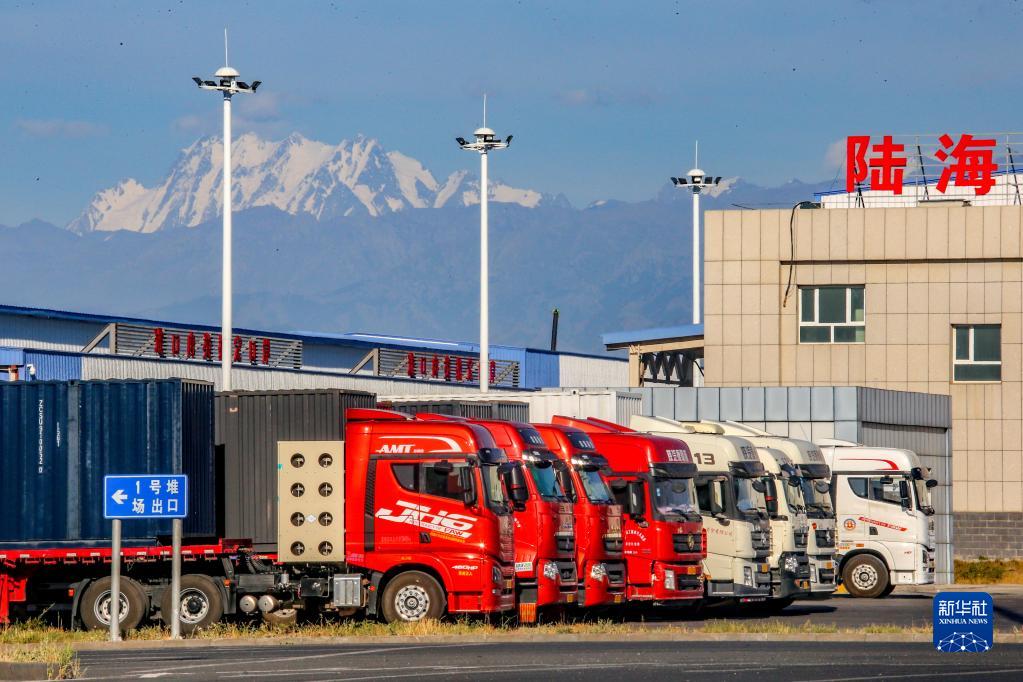 貨運(yùn)卡車在烏魯木齊國(guó)際陸港區(qū)排隊(duì)等待檢驗(yàn)(2022年7月14日攝)。新華社發(fā)(蔡增樂 攝)