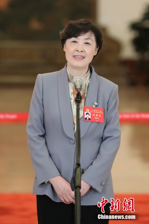 10月16日,中國共產黨第二十次全國代表大會在北京人民大會堂開幕。大會開幕前,舉行“黨代表通道”采訪活動。圖為於若飛代表接受采訪。 中新社記者 蔣啟明 攝