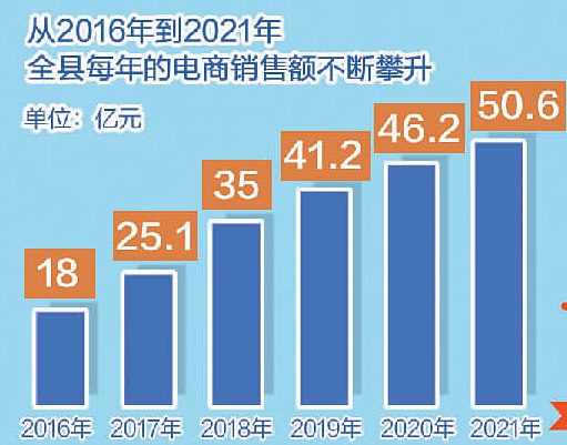 “大進(jìn)大出、快進(jìn)快出”模式,幫助武功電商快速搶占地盤(pán),站到了新臺(tái)階上。18億元、25.1億元、35億元、41.2億元、46.2億元、50.6億元,從2016年到2021年,武功縣每年的電商銷(xiāo)售額不斷攀升。