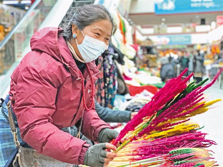 早在1月18日,八廓商城年貨市場就以全區(qū)低收入群體為主,通過抽簽式發(fā)放攤位269個。今年,八廓商城年貨攤位主要包括糖果、木制品、酥油、酥油花、奶制品、“卡賽”、對聯(lián)、青稞草、青稞花、風(fēng)干牦牛肉等。