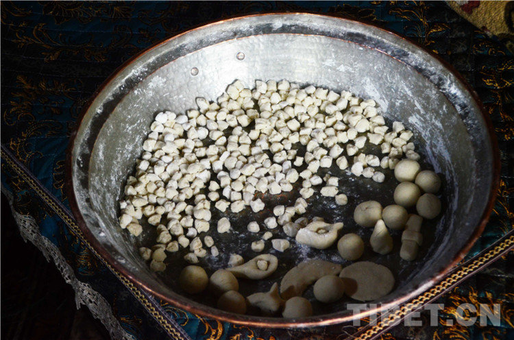 估量著量差不多夠一家人吃后,就開始準(zhǔn)備晚上的重頭戲——在面團(tuán)中包入辣椒、羊毛、木炭等物品,就像春節(jié)時餃子里的硬幣一樣,古突中包入的物品也有著不同的意義。比如白羊毛寓意性情溫和,辣椒寓意牙尖嘴利等。同時還捏出了太陽、月亮等形狀的面團(tuán),也都有著吉祥美好的寓意。