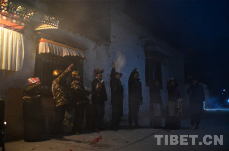 酒足飯飽后,“驅(qū)鬼”儀式開始。家人們一起各自用糌粑從頭到腳觸碰一遍、捏下手印后,與故意吃剩的一點古突扔進(jìn)驅(qū)鬼盤,寓意將身心中的病痛與不詳全部拋掉。隨后查斯點燃火把,一邊喊著“所有妖魔都出去”,一邊手持火把跑往所有屋子各掃幾下,拿著火把和驅(qū)鬼盤到交叉路口焚燒掉。一路狂奔,且不能回頭。