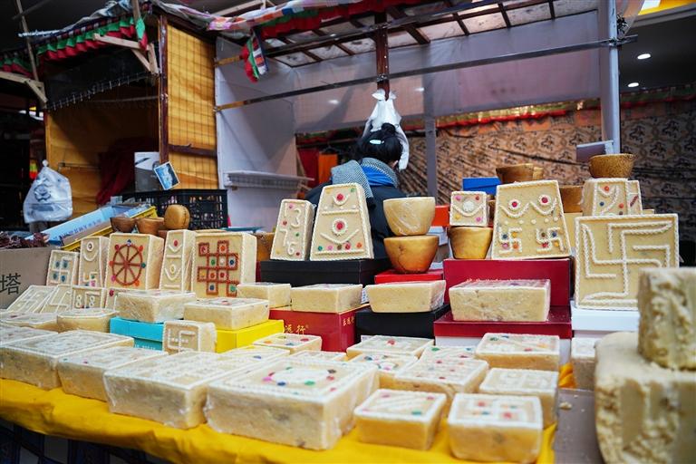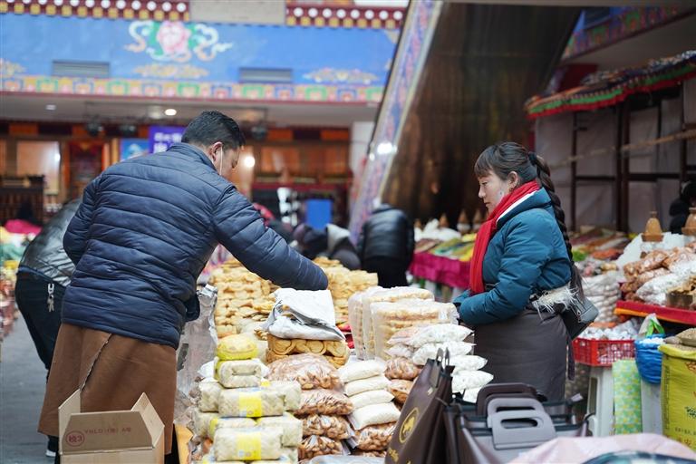 2月16日,記者來到拉薩市八廓商城與沖賽康市場。風(fēng)干肉、羅薩梅朵、卡賽、切瑪盒……攤位上各類年貨琳瑯滿目,一應(yīng)俱全,置辦年貨的人們?nèi)宄扇旱剡呑哌吿暨x自己中意的物品,準(zhǔn)備歡度藏歷新年。走進(jìn)八廓商城立馬便被里面熱鬧的場景所吸引,詢貨問價的聲音不絕于耳。走到攤前,不等顧客開口,店家便會熱情地推銷起自己的貨物。