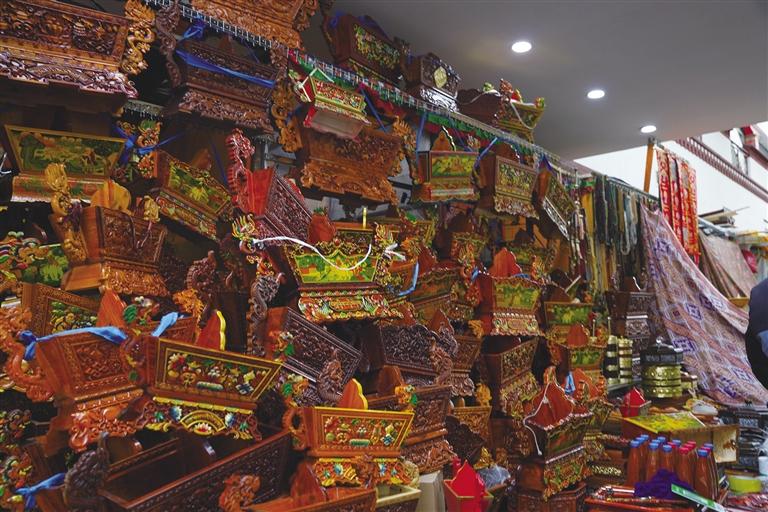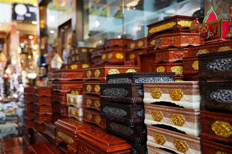 巴桑站在店門口展示著自家的切瑪盒,“我們家的切瑪盒做的可是一絕,而且不會因?yàn)榭爝^年了就胡亂加價,50元至500元的都有,很多顧客都是從其他地方趕過來買。你看上面插的酥油花,這也是我父親做的,別看不大,每個都要兩三個小時才能做好?!卑蜕Uf。