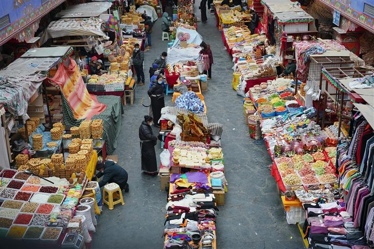 手持羅薩梅朵的小孩在大街小巷里歡笑;腳邊放置著大量年貨的顧客正和老板磋商著手中切瑪盒的價格;阿佳一手提著采購好的年貨,一手牽著孩子稚嫩的小手……在藏歷新年來臨之際,這座千年古城被喜氣洋洋的人群交織出了濃濃的煙火氣息。(圖/記者 阿旺尼瑪)
