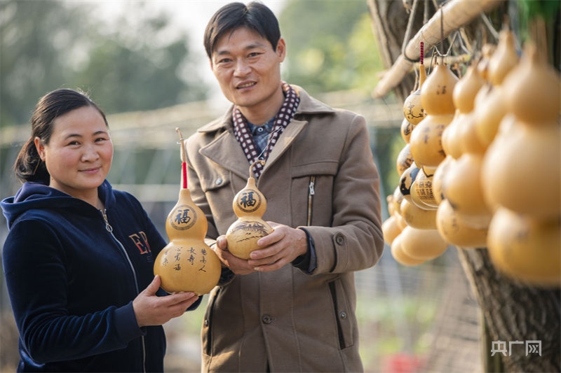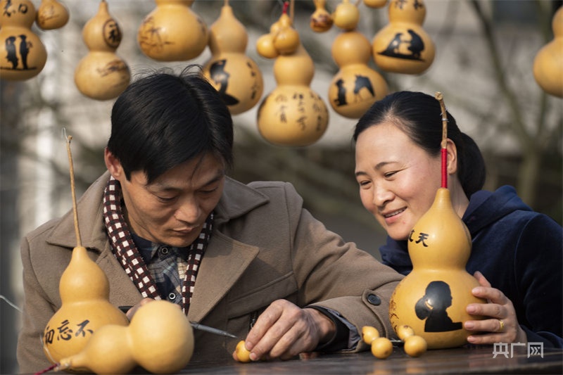 習(xí)小龍和妻子展示他們的葫蘆作品。(央廣網(wǎng)發(fā) 趙春亮 攝)