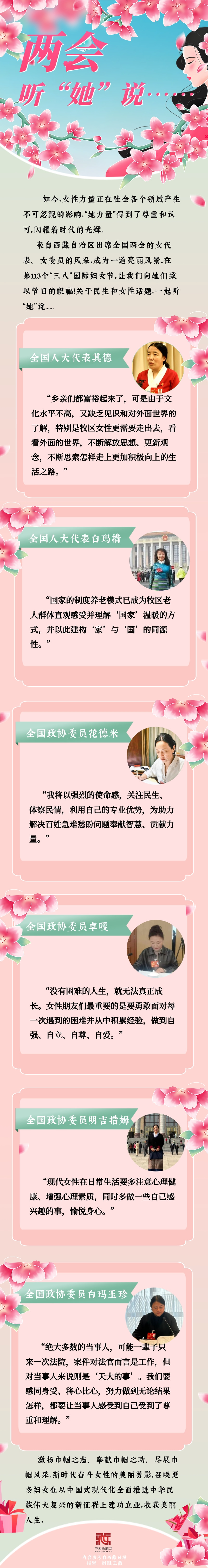 2023年全國兩會(huì),新一屆全國人大代表和全國政協(xié)委員首次亮相。在“三八”國際勞動(dòng)?jì)D女節(jié)來臨之際,讓我們一起來領(lǐng)略西藏女代表、女委員的履職風(fēng)采![詳細(xì)] -