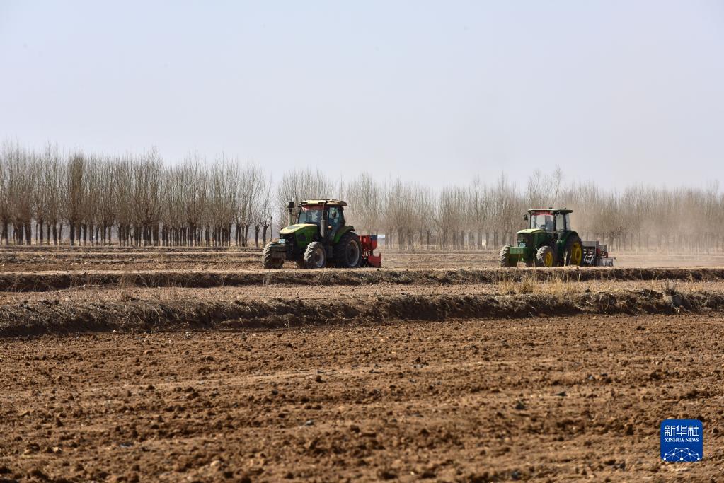 在寧夏銀川市賀蘭縣立崗鎮(zhèn)蘭星村,農民駕駛農機播種春小麥(2023年3月3日攝)。新華社記者 李旭倫 攝