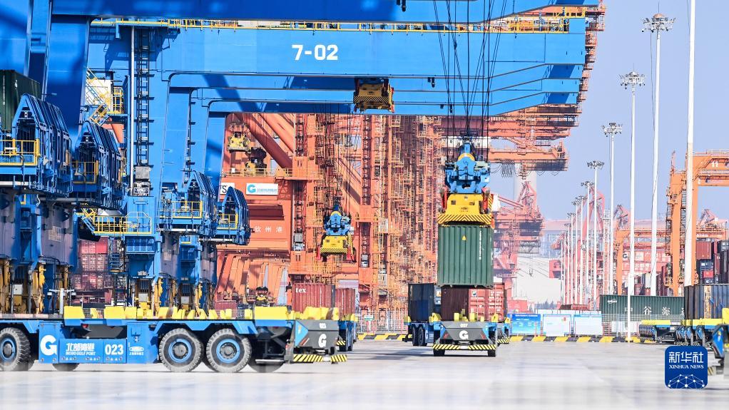 在廣西欽州港自動化集裝箱碼頭,無人駕駛車輛在轉運集裝箱(2023年2月25日攝)。新華社記者 張愛林 攝
