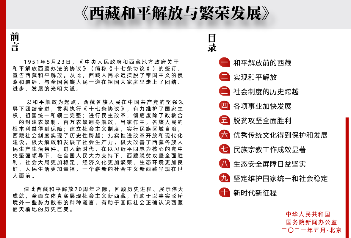 國務(wù)院新聞辦公室21日發(fā)表《西藏和平解放與繁榮發(fā)展》白皮書。全文如下: