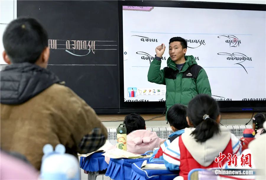 2023年3月14日,西藏拉薩市第一小學(xué)藏語(yǔ)文老師拉巴次仁在課堂提問(wèn)。李林 攝