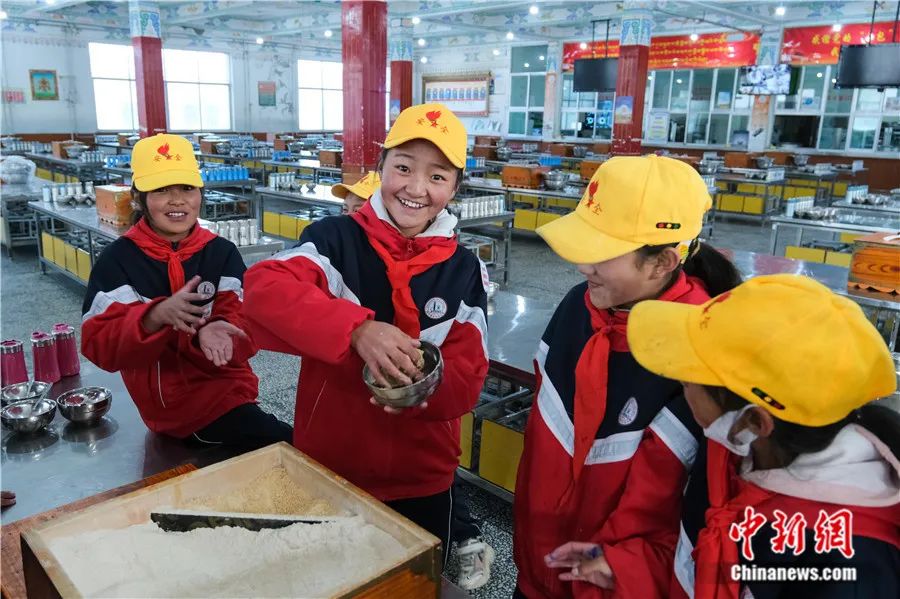 2023年10月13日,班戈縣中石化小學(xué)六年級(jí)一班尼瑪拉增(左二)在學(xué)校食堂捏糌粑,孩子們說(shuō)她們的早餐便是以糌粑為主。該校四至六年級(jí)多是寄宿制住校生。江飛波 攝