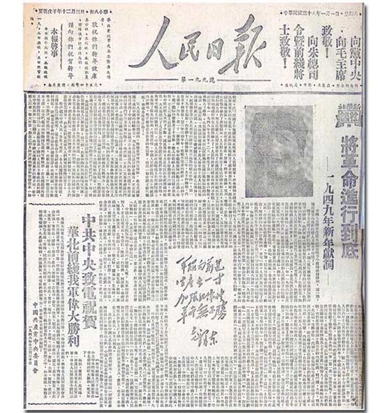 圖為1949年1月1日《人民日?qǐng)?bào)》第1版刊登的新華社社論《將革命進(jìn)行到底——一九四九年新年獻(xiàn)詞》。圖片來(lái)源:中國(guó)軍網(wǎng)
