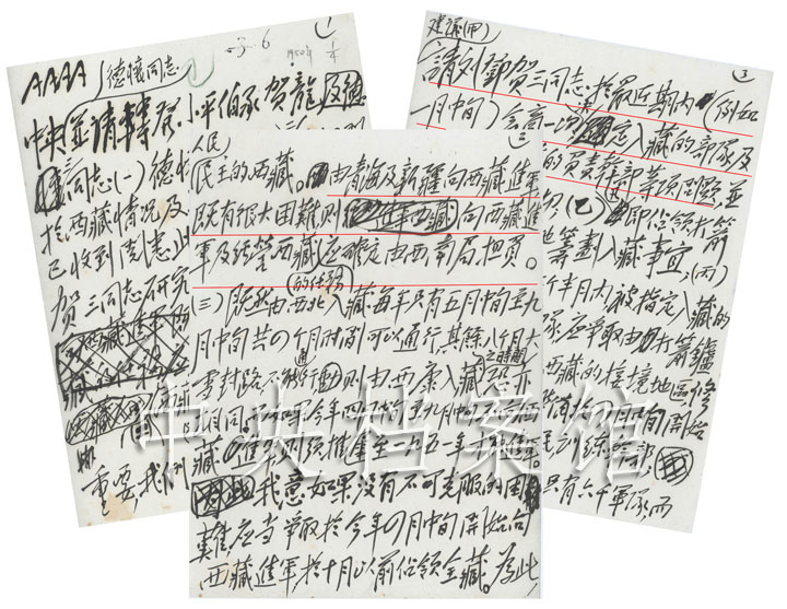 圖為1950年1月2日,毛澤東關(guān)于四月中旬進(jìn)軍西藏問(wèn)題的建議給中央和彭德懷、鄧小平、劉伯承、賀龍的電報(bào)(節(jié)錄)。圖片來(lái)源:中央檔案館