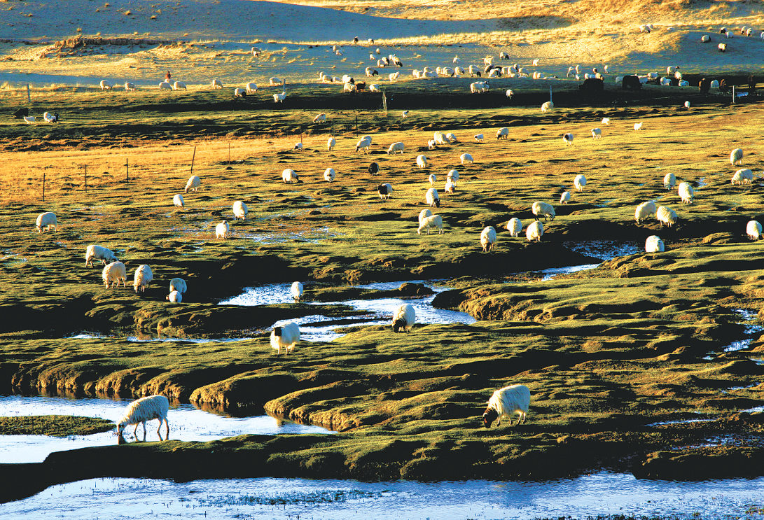 盛夏的金銀灘草原綠草如茵,花開萬頃。草原上,牧民騎著駿馬穿梭在雪白的羊群和棕黑相間的牦牛群間,蓮花般的帳房星星點(diǎn)點(diǎn)地散落在青草和野花叢中,如詩(shī)如畫、美不勝收,呈現(xiàn)出人與自然和諧相處的美妙景象。