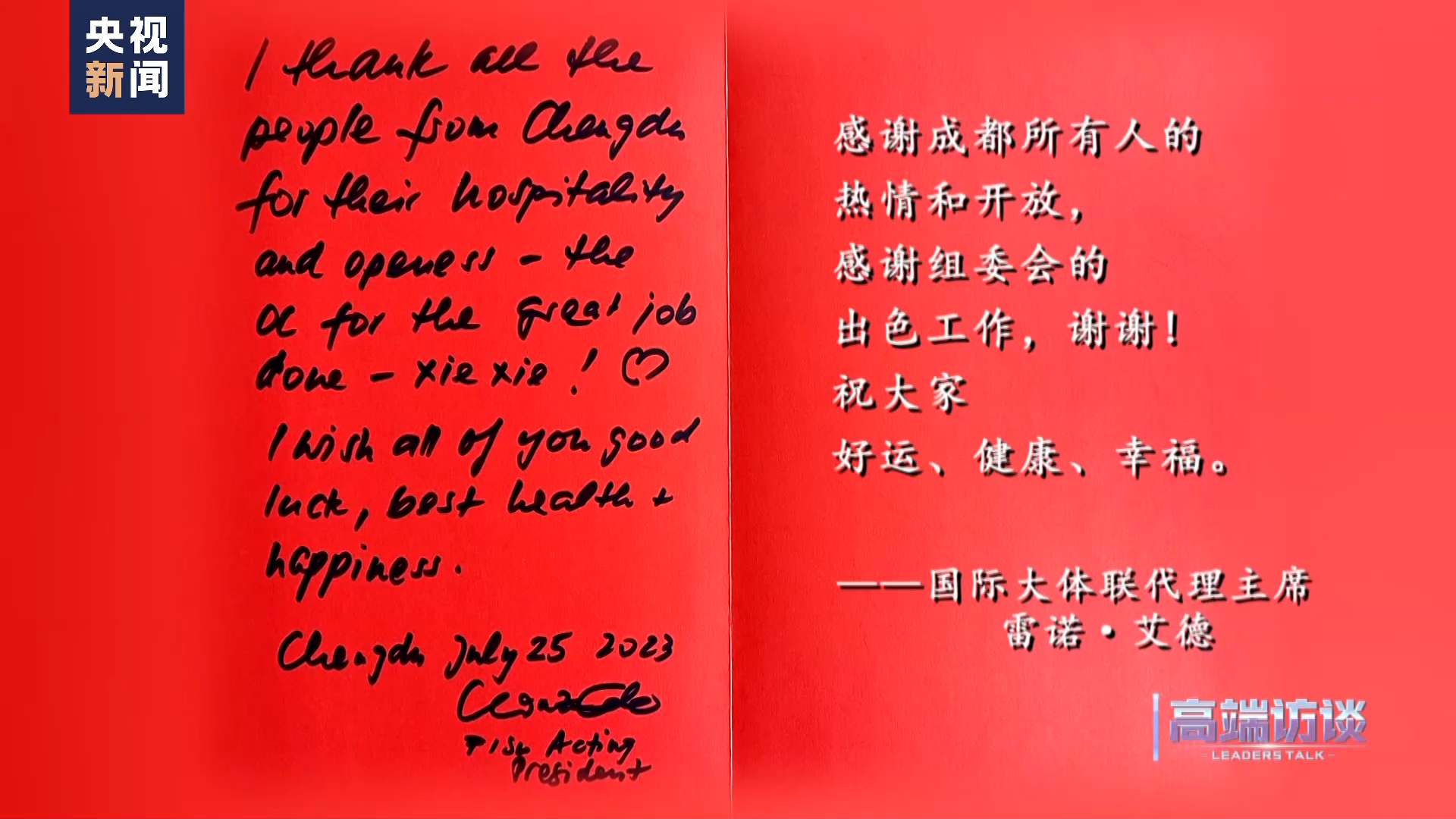 國(guó)際大體聯(lián)代理主席雷諾 艾德在接受總臺(tái)專(zhuān)訪(fǎng)后題詞:感謝成都所有人的熱情和開(kāi)放,感謝組委會(huì)的出色工作,謝謝!祝大家好運(yùn)、健康、幸福。