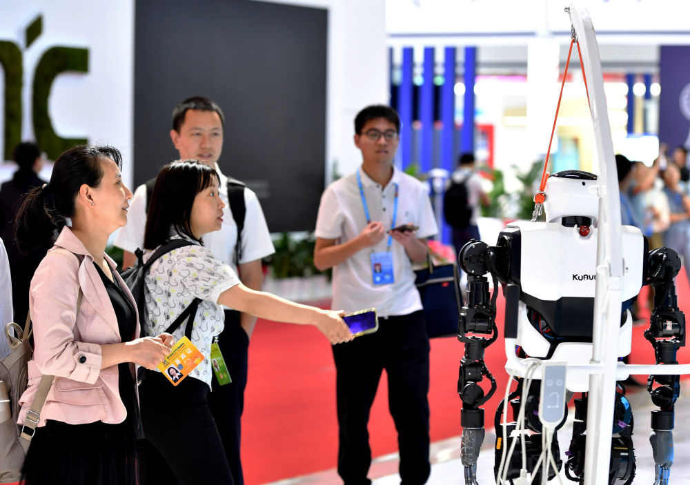 5月24日,在第七屆數(shù)字中國建設(shè)峰會現(xiàn)場體驗區(qū),觀眾在觀看“移動愛家機(jī)器人”。新華社記者魏培全攝