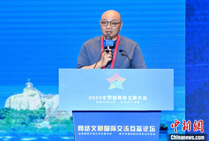 7月18日,2023年中國(guó)網(wǎng)絡(luò)文明大會(huì)網(wǎng)絡(luò)文明國(guó)際交流互鑒論壇在廈門舉辦。圖為完美世界首席執(zhí)行官蕭泓作主題演講。中新社記者 王東明 攝