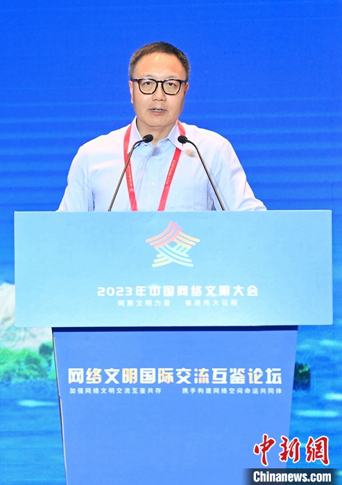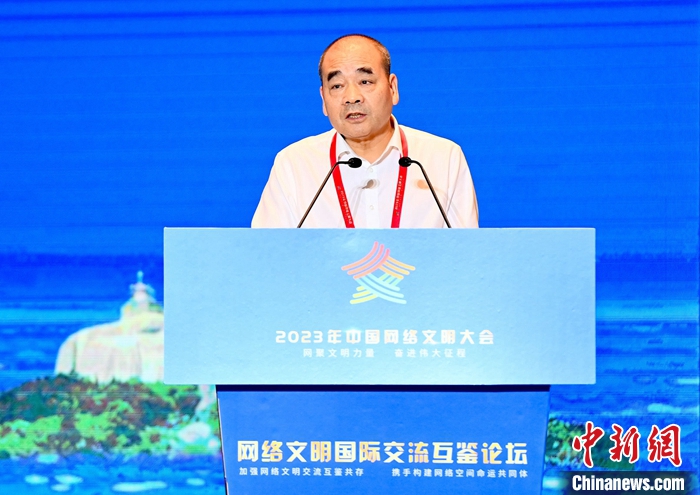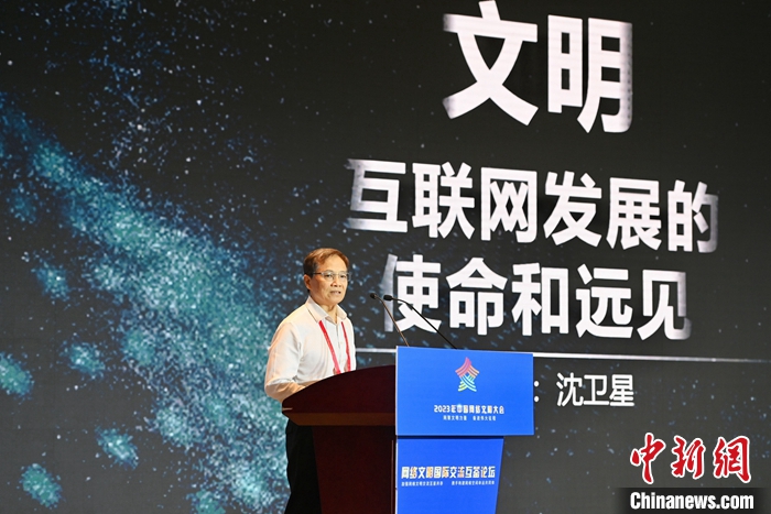 7月18日,2023年中國(guó)網(wǎng)絡(luò)文明大會(huì)網(wǎng)絡(luò)文明國(guó)際交流互鑒論壇在廈門舉辦。圖為光明日?qǐng)?bào)原副總編輯、浙大城市學(xué)院文明與傳播研究院研究員沈衛(wèi)星作主題演講。中新社記者 王東明 攝