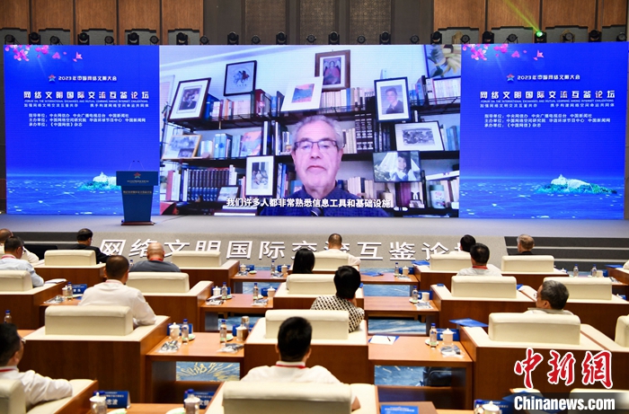 7月18日,2023年中國(guó)網(wǎng)絡(luò)文明大會(huì)網(wǎng)絡(luò)文明國(guó)際交流互鑒論壇在廈門舉辦。圖為比利時(shí)國(guó)際聯(lián)合倡議多邊合作組織榮譽(yù)主席米歇爾·杰諾韋塞作視頻演講。中新社記者 王東明 攝